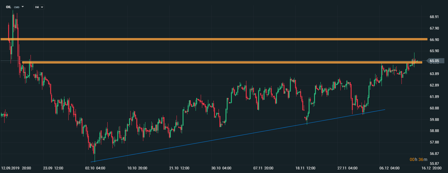 Cena ropy Brent (OIL) testuje psychologickú hranicu 65 USD/bbl. V prípade, ak bude support udržaný, otvorí sa priestor pre dodatočný rast k úrovni 67 USD/bbl. Ceny ropy podporuje podpísanie obchodnej dohody a zníženie produkcie krajín OPEC. Zdroj: xStation5