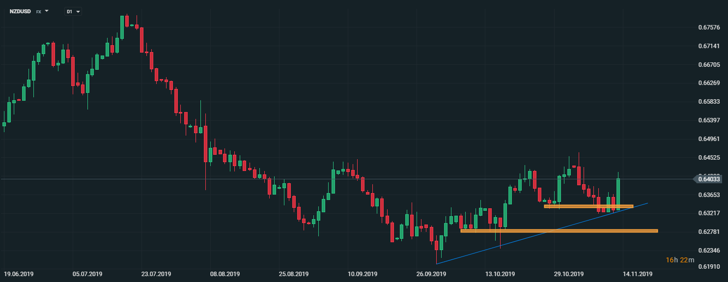 Menový pár NZDUSD sa odrazil do supportu na úrovni 0,633 a v súčasnosti testuje úroveň 0,640. V prípade, ak cena dokáže prekonať vyššie spomínanú úroveň, otvorí sa priestor pre dodatočný rast k hranici 0,645. Zdroj: xStation