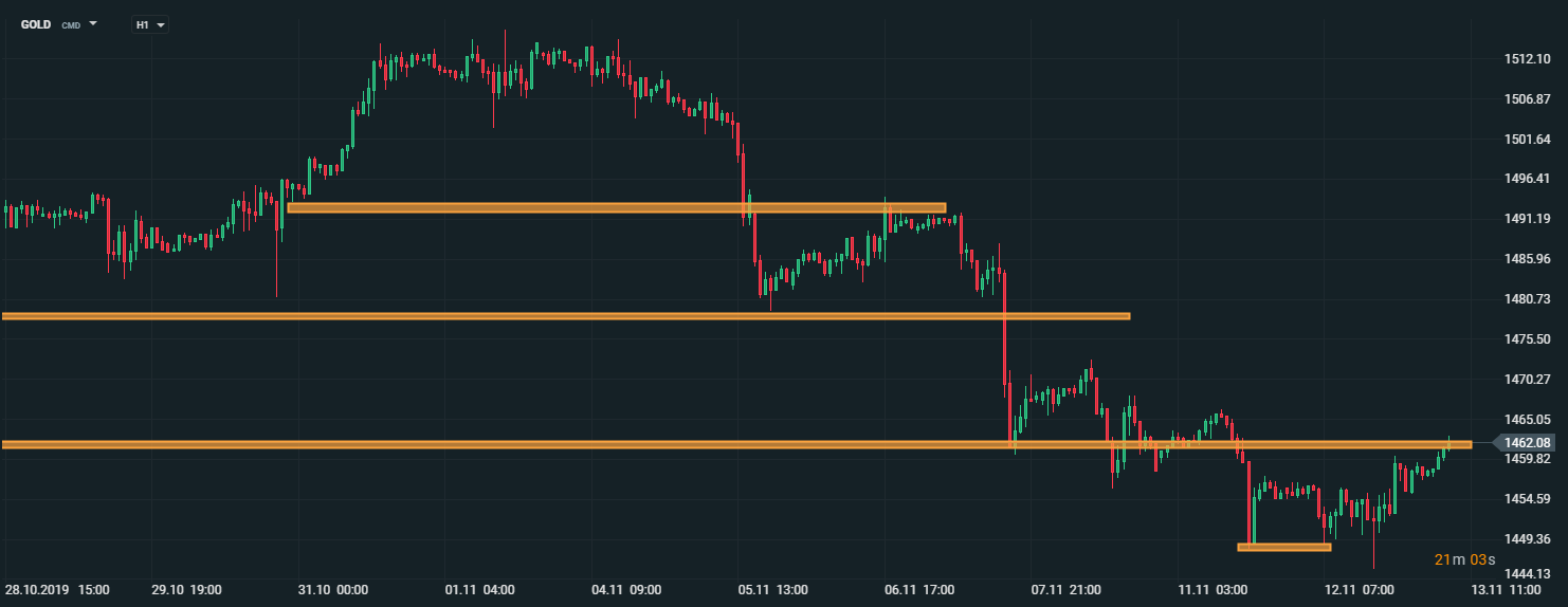 Cena zlata sa odrazila od hranice 1445 USD a v súčasnosti testuje úroveň 1463 USD. V prípade, ak cena nedokáže prekonať súčasnú úroveň rezistencie, otvorí sa opäť priestor pre pokles k lokálnym minimám k hranici 1445 USD. Zdroj: xStation