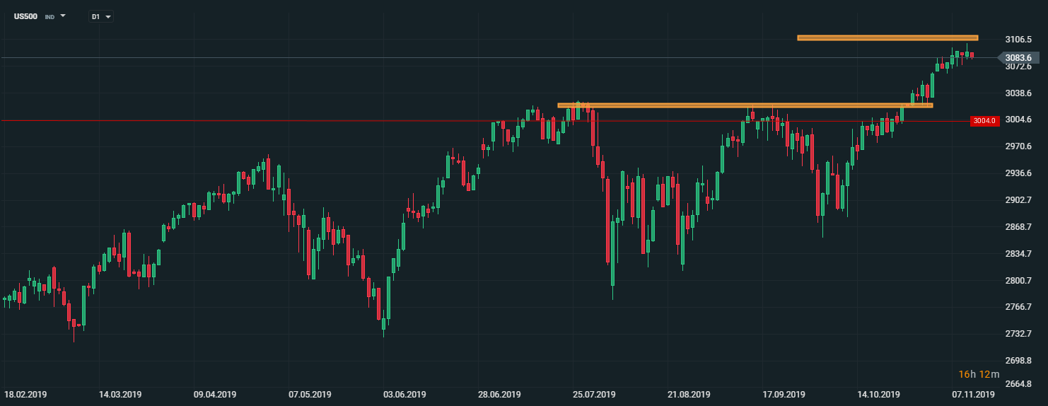 Americký akciový index US500 sa odrazil od psychologickej hranice 3100 bodov. Index sa v súčasnosti obchoduje v blízkosti úrovne 3080 bodov. V prípade pozitívnych správ by sme sa opäť mohli dostať k testovaniu historicky najvyšších úrovní. Majte na pamäti, že dnešný makroekonomický kalendár obsahuje množstvo dôležitých dát, a teda nedá sa vylúčiť, že akcie budú volatilnejšie. Najmä prípadný pokles inflácie v USA by mohol zvýšiť pravdepodobnosť zníženia úrokových sadzieb FEDom, čo by mohlo viesť k výraznejšej korekcii. (To je asi najvýraznejšie riziko dnešného dňa). Zdroj: xStation