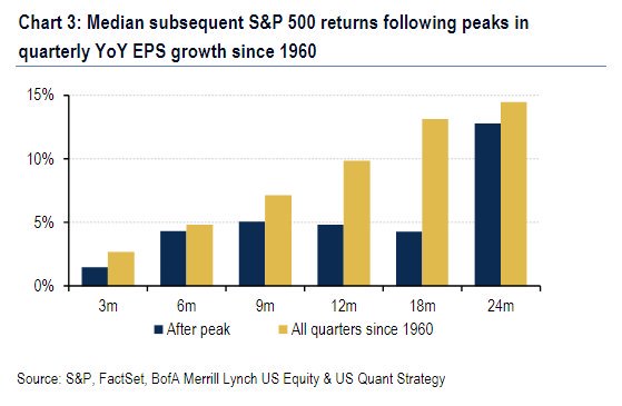 História ukazuje, že po dosiahnutí vrcholu v raste ziskov zvykne v najbližších 18 mesiacoch rásť index pomalšie ako obvykle. A to ani nie o 5%. Bežný rast za 18 mesiacov je okolo 13%. V nasledujúcich 6 mesiacoch (teda medzi 18 a 24 mesiacom) sa to však už zvykne napraviť a výkonnosť sa vyrovnáva (@Callum_Thomas):