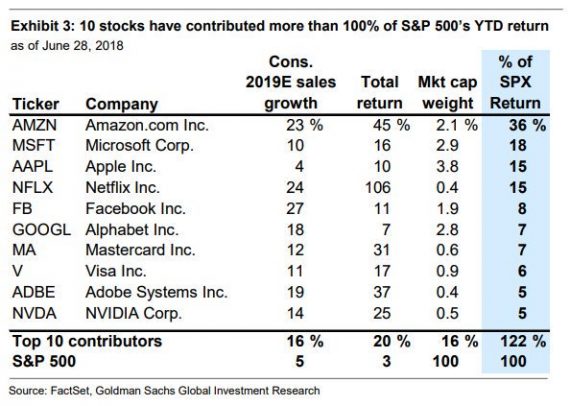 Ďalším faktorom hovoriaci ukazujúci budúce riziko pre S&P 500 je brutálna dominancia technologických akcií, ktorá však nemusí byť dlhodobo prítomná. Len šesť spoločností je zodpovedných za 99% tohtoročných ziskov v indexe. Amazon dokonca za viac ako tretinu. Keď si zoberieme 10 najväčších prispievateľov k tohtoročnej výkonnosti, tak sa postarali o 122% rastu indexu. Bez nich by bol teda S&P 500 medziročne v mínuse. Čiže rast indexu je aktuálne závislý na veľmi úzkej skupine akcií.