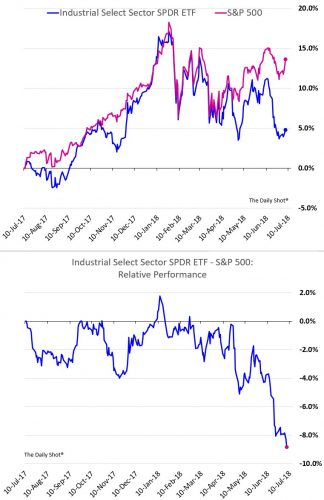 Vývoj výkonnosti indexu S&P 500 a akcií priemyselných spoločností za posledný rok (@SoberLook):