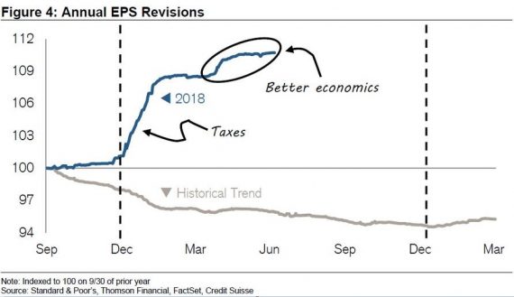 Vyzerá to tak, že medziročný rast ziskov na akciu v americkom indexe S&P má svoj vrchol za sebou. Po 25%-nom medziročnom raste ziskov v prvom kvartáli sa pre druhý kvartál prognózuje spomalenie na 20%. Je reálne, že v druhom kvartáli bude rast ešte vyšší, v ďalšom priebehu roka by sa však už mal spomaliť. Za tento mimoriadne rýchly rast ziskov, ktorý je pre túto časť ekonomického cyklu bezprecedentný (takto rýchlo rastú zisky len po recesii), sú v prvom rade zodpovedné nižšie korporátne dane (kvôli ktorým sa upravovali prognózy ziskov nahor začiatkom roka) a aj silná ekonomika (ktorá pomáhala ziskom v minulom kvartáli). Ako ukazuje šedá čiara v grafe nižšie, tak je to z historického pohľadu neštandardná situácia, prognózy ziskov bývajú obvykle revidované nadol.