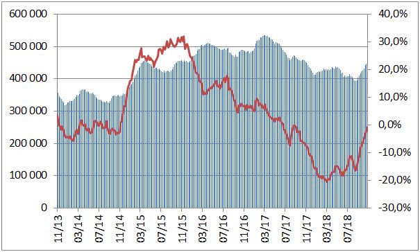 Vývoj zásob ropy v USA (tis. barelov, modrá) a medziročnej zmeny (červená)