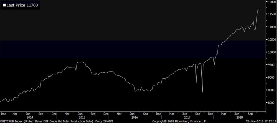 Ťažba stagnuje tretí týždeň po sebe. To je pre ropu skôr negatívna správa. Po prudkom raste z prelomu októbra a novembra totiž panovala neistota, že kam sú až schopné vyššie ceny ropy vystreliť ťažbu v USA. Je síce pravda, že ešte môžu nastať určité oneskorené efekty, pri súčasných cenách sa však americkí bridlicoví producenti nebudú hnať do otvárania nových vrtov a rast ťažby by tak mohol spomaliť, prípadne sa aj zastaviť.