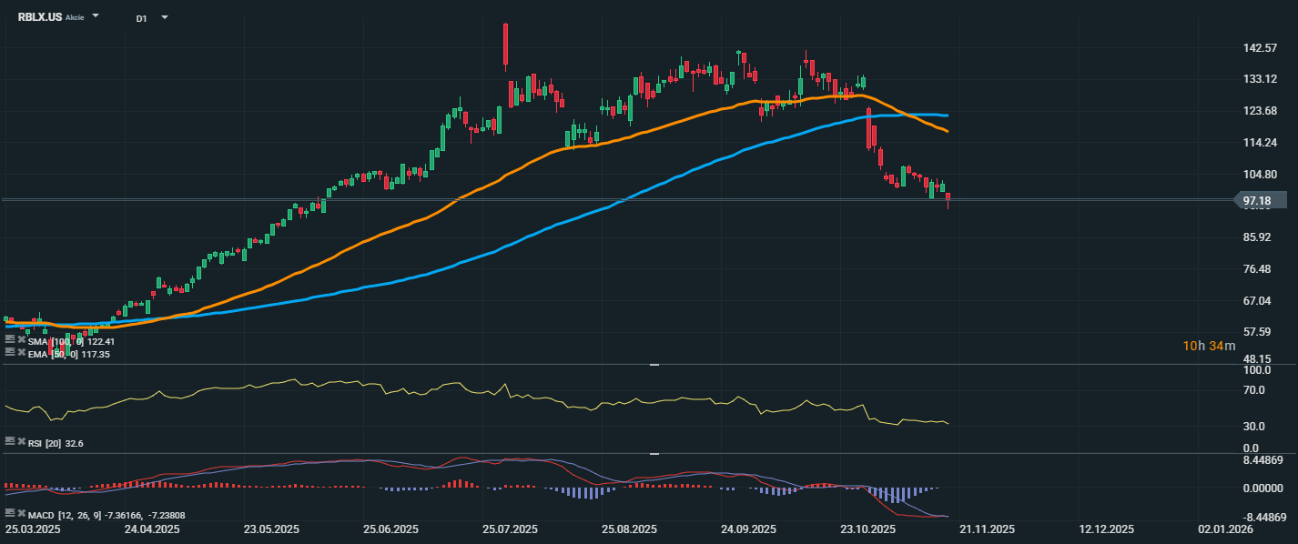 Akcie společnosti Roblox aktuálně pokračují v poklesu a obchodují se na úrovni 97,18 USD, což představuje výrazný propad ze zářijových maxim. Cena se nachází hluboko pod klouzavými průměry – EMA 50 (117,35 USD) i SMA 100 (122,41 USD), což potvrzuje silný medvědí trend. RSI se nachází na hodnotě 32,6, tedy těsně nad hranicí přeprodanosti (30), což signalizuje silný prodejní tlak, ale i možnost blížící se krátkodobé úlevové korekce.