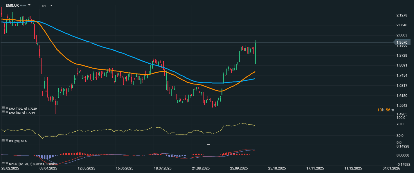 Akcie společnosti Man Group se aktuálně obchodují za 1,9570 GBP, což odpovídá úrovni, kterou naposledy dosáhly začátkem dubna. Technické indikátory potvrzují silné býčí momentum. Cena se stabilně drží nad klouzavými průměry, přičemž EMA 50 (1,7719 GBP) i SMA 100 (1,7259 GBP) byly jasně proraženy směrem vzhůru. RSI dosahuje hodnoty 68,6, tedy se nachází těsně pod hranicí překoupeného pásma, což svědčí o silném nákupním zájmu, avšak zároveň signalizuje možné krátkodobé vyčerpání. MACD zůstává v býčí konstelaci, nad signální linií, přičemž histogram ukazuje pokračující růstový trend.