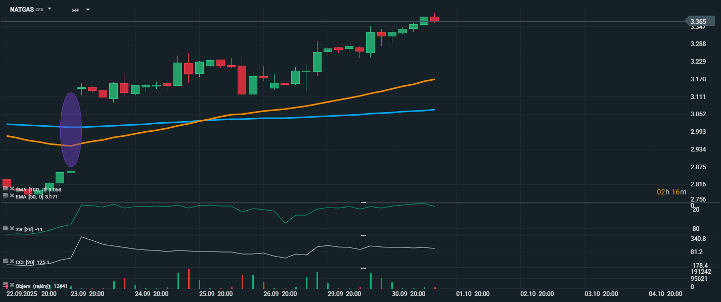Cena zemního plynu se v posledních dnech dostala do silného růstového trendu a aktuálně se obchoduje na hodnotě 3,365 USD. Na grafu je zvýrazněn fialový kruh, který označuje rollování kontraktu – tento proces vytvořil doposud nevyplněný cenový gap. CCI se nachází na hodnotě 125,1, tedy v pásmu překoupenosti, a %R ukazuje na úroveň -11, což rovněž potvrzuje silný nákupní tlak.