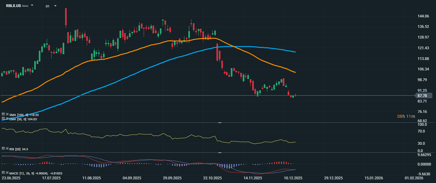 Akcie společnosti Roblox se aktuálně obchodují kolem úrovně 87,78 USD a pokračují v sestupném trendu, který začal koncem října. Cena se nachází výrazně pod klouzavými průměry – EMA 50 (104,03 USD) i SMA 100 (118,53 USD) – což potvrzuje dlouhodobě negativní technické nastavení. RSI (34,3) se blíží přeprodané oblasti, což signalizuje slábnoucí prodejní tlak, ale zatím bez známky obratu.
