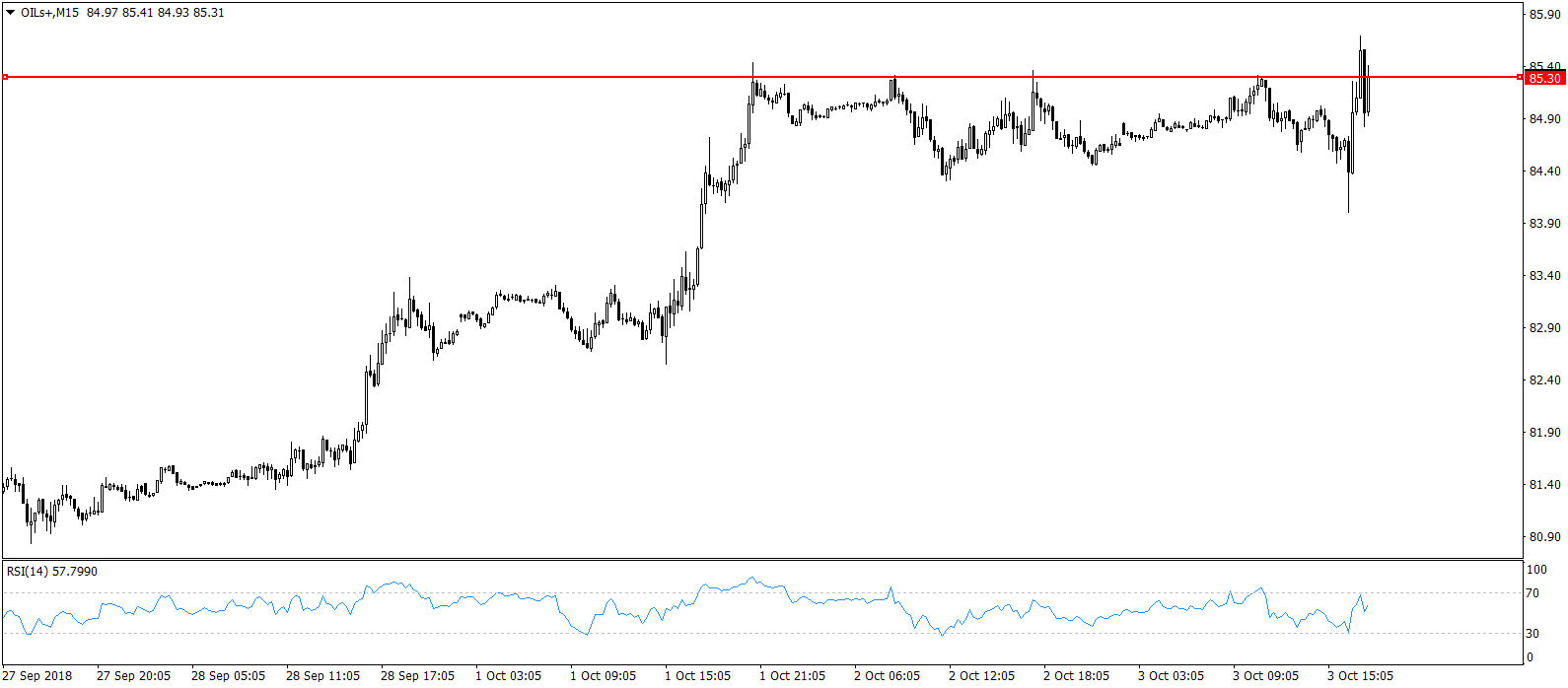 Americká zásoby ropy podľa čerstvo zverejnených dát v minulom týždni prudko vzrástli. A to o 8 mil. barelov (čakal sa pritom rast o zhruba milión barelov). Bol to najrýchlejší rast od februára 2017. Ropa však aj napriek tomu reagovala pozitívne a vyskočila novú najvyššiu úroveň od roku 2014. Dlho sa tam však neudržala, rast zastavil support nad úrovňou 85 USD za barel.