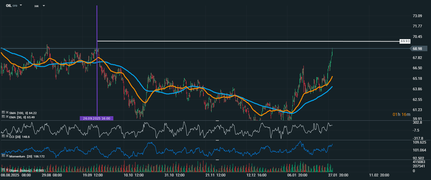 Cena ropy Brent zažívá prudký růstový impuls, když vystřelila na úroveň 68,98 USD, čímž se přiblížila k významné rezistenci na 69,93 USD, která se formovala naposledy koncem září 2025. Tento pohyb odráží aktuální geopolitické napětí kolem Íránu a silnou reakci trhu na nové hrozby ze strany USA. Technicky se cena odrazila od oblasti kolem 61 USD a prorazila nad klouzavé průměry EMA 50 (65,49 USD) a SMA 100 (64,22 USD), které nyní fungují jako silná podpora. Růst je doprovázen výrazným nárůstem objemů, což svědčí o silné účasti kupců. CCI dosáhl hodnoty +148, což ukazuje na překoupenost, zatímco momentum je na velmi vysokých hodnotách (106,1), což potvrzuje sílu aktuálního trendu. Oba indikátory signalizují, že trh je v silném býčím rozpoložení, ale zároveň se nachází v zóně, kde nelze vyloučit krátkodobou korekci. Pokud se cena udrží nad 68 USD, může dojít k otestování rezistence na 69,93 USD, jejíž průraz by otevřel cestu směrem k psychologické úrovni 70 USD a dále. V opačném případě by korekce mohla směřovat zpět k oblasti podpory mezi 65,50–64,20 USD, kde se sbíhají klouzavé průměry.
