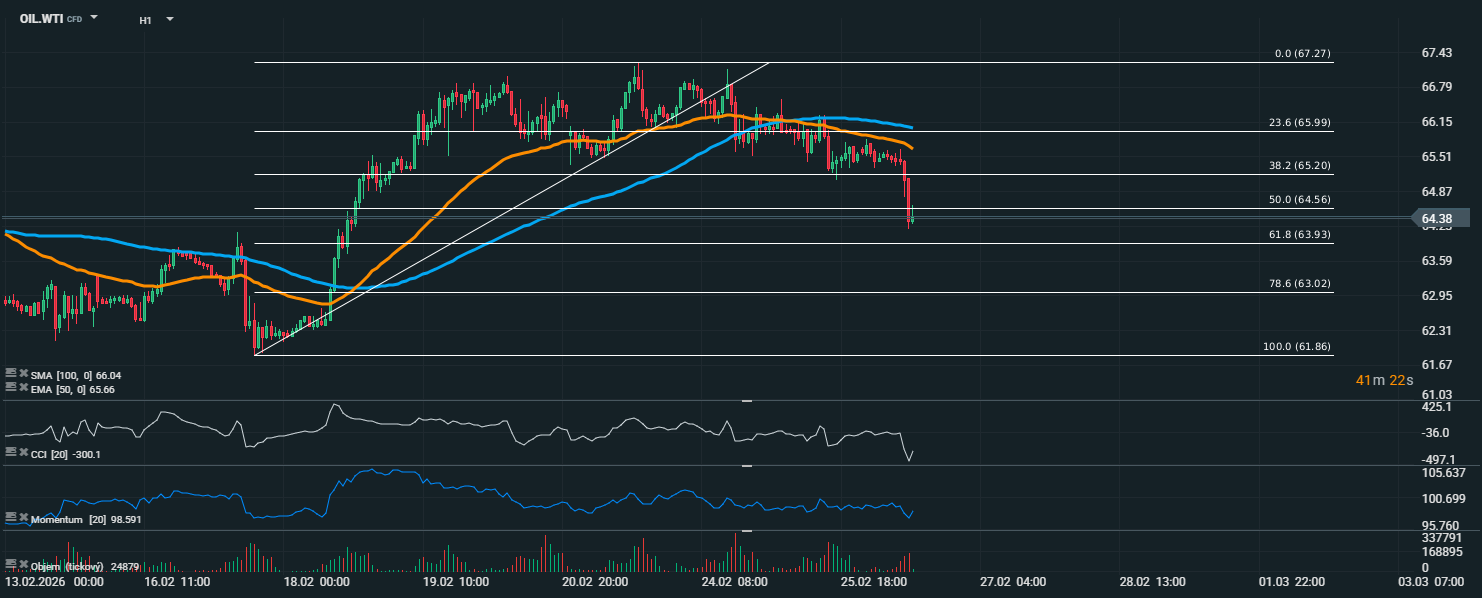 Cena ropy WTI se aktuálně pohybuje kolem 64,38 USD a po výrazném výprodeji prorazila několik klíčových technických úrovní. Průraz pod 50% Fibonacciho retracement (64,56 USD) otevřel prostor pro další oslabení, přičemž nejbližší významná podpora se nachází až na úrovni 61,8 % (63,93 USD). Ropa se současně obchoduje pod klouzavými průměry EMA 50 (65,66 USD) i SMA 100 (66,04 USD), což potvrzuje krátkodobé medvědí nastavení trhu. Oba průměry nyní fungují jako dynamická rezistence a mohou omezovat případné korekční růsty. CCI signalizuje výraznou přeprodanost, což může vést ke krátkodobé technické korekci. Momentum však zůstává slabé a potvrzuje pokračující prodejní tlak.