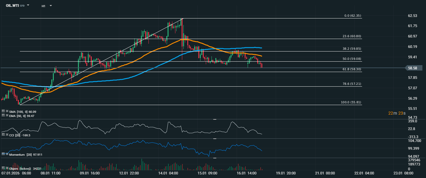 Cena americké ropy WTI se aktuálně obchoduje kolem úrovně 58,58 USD, přičemž po nedávném růstu došlo k obratu trendu a návratu k nižším hodnotám. Na vrcholu růstového pohybu dosáhla cena maxima 62,35 USD, odkud následně klesla až k současné úrovni poblíž 61,8 % Fibonacciho retracementu (58,30 USD), což je klíčová technická podpora. SMA 100 (60,09 USD) i EMA 50 (59,47 USD) byly v posledních hodinách proraženy směrem dolů, což značí slábnoucí trend a přechod do korekční fáze. Tento signál je podpořen i indikátory: