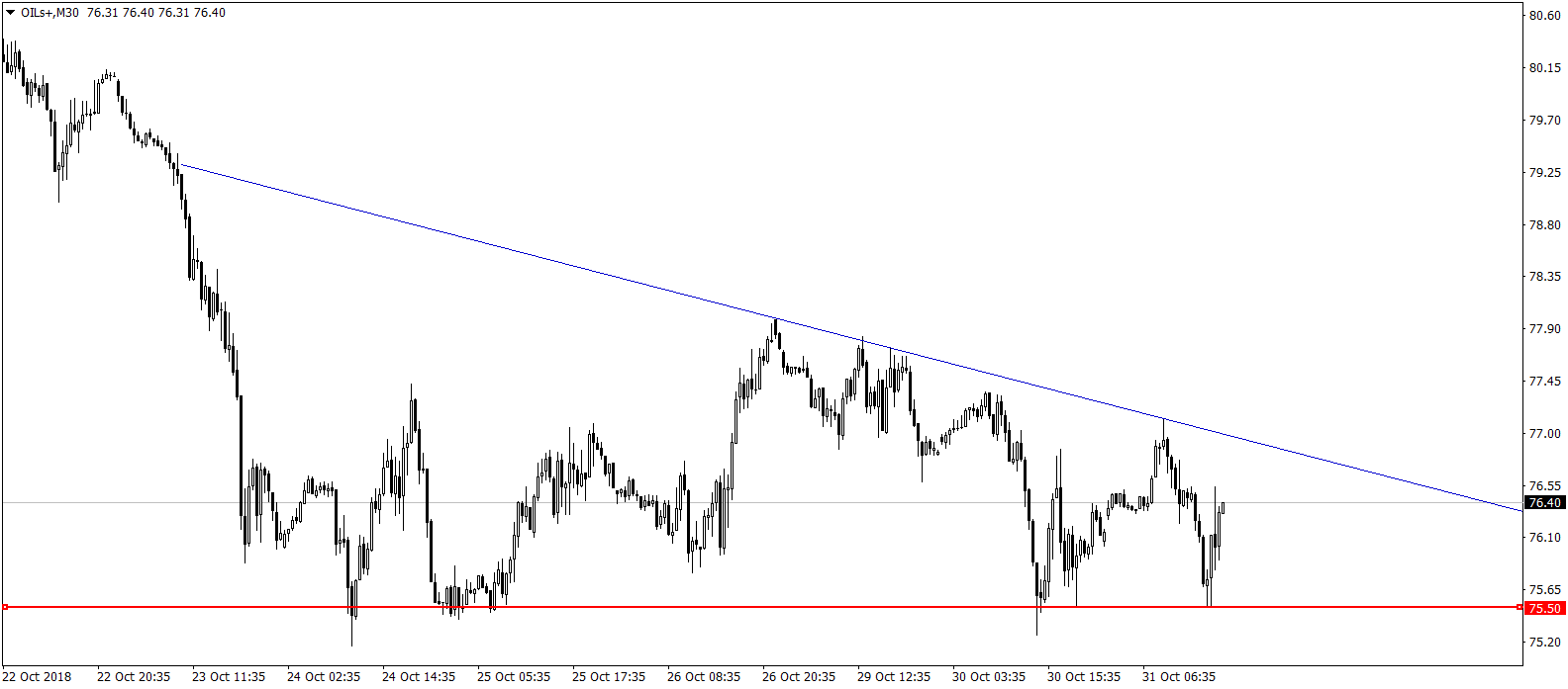 Z krátkodobého hľadiska to teda vyzerá, že budú na rope rozhodovať technické faktory. Okrem už spomínaného supportu pri 75,5, sa vyformovala aj klesajúca horná trendová čiara, ktorá spolu so supportom vytvára klesajúcu trojuholníkovú formáciu.