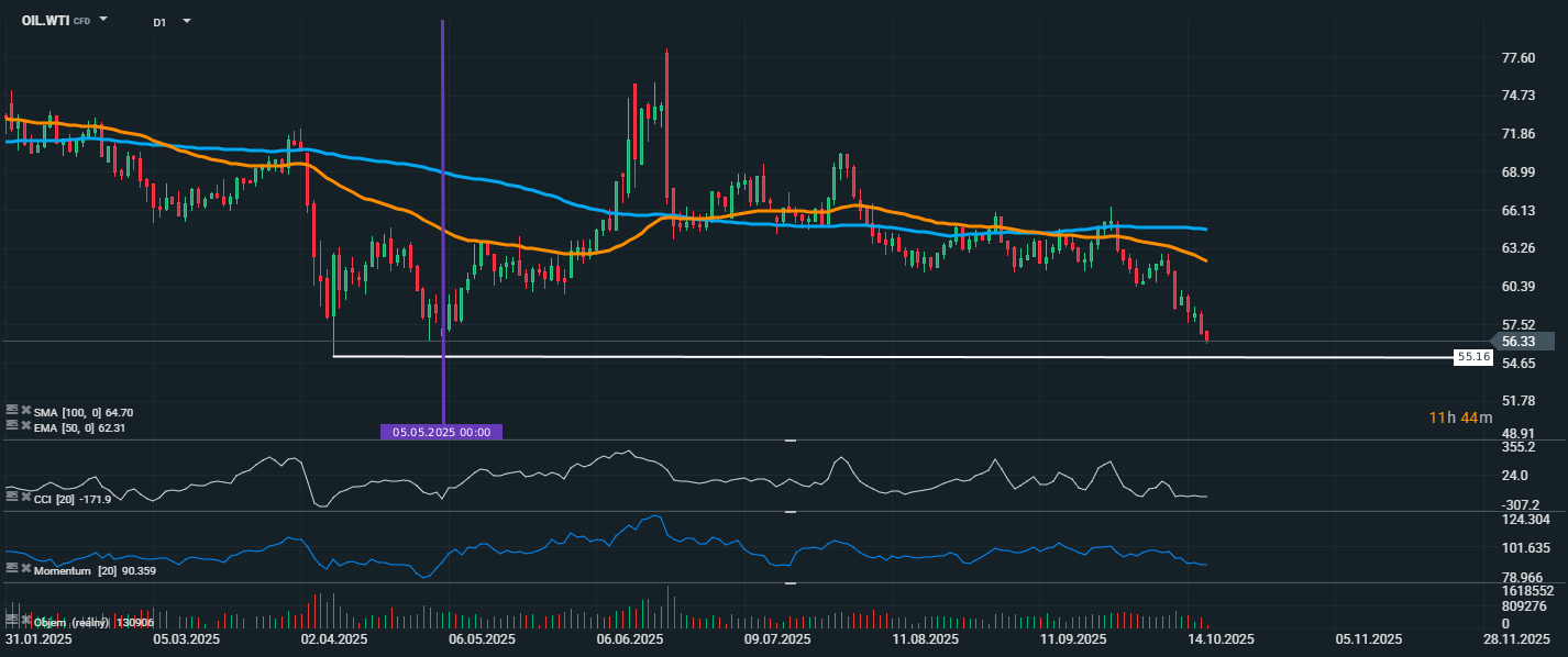Cena americké ropy WTI pokračuje v klesajícím trendu a aktuálně se obchoduje kolem 56,3 USD. Nejbližší support se nachází kolem 55,16 USD, jedná se o cenovou hladinu, která byla naposledy testována na začátku května 2025 a osvědčila se jako obratová zóna. Klouzavé průměry EMA 50 (62,31 USD) a SMA 100 (64,70 USD) byly výrazně proraženy směrem dolů a nyní fungují jako silné rezistence, což potvrzuje negativní trend. Pokles je doprovázen zvyšujícím se objemem obchodů, což ukazuje na sílu prodejců. CCI se propadl hluboko do přeprodané zóny a aktuálně dosahuje hodnoty -171,9, což naznačuje extrémní výprodej, ale zatím bez známky obratu. Momentum se drží v záporných hodnotách, což odráží pokračující ztrátu síly kupců.