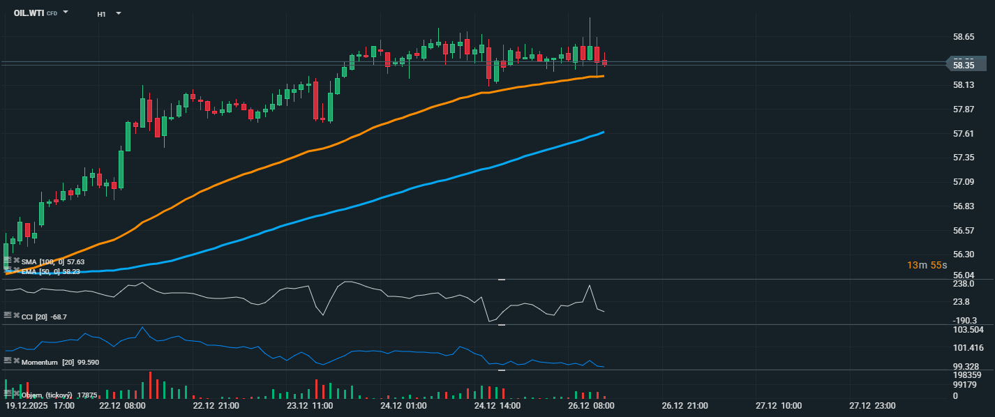 Cena ropy WTI se aktuálně obchoduje na úrovni 58,35 USD a zůstává nad klíčovými klouzavými průměry. EMA 50 (oranžová) se nachází na úrovni 58,23 USD, což představuje aktuální technickou podporu. SMA 100 (modrá) je ještě níže na 57,63 USD, a slouží jako další opora v případě poklesu. CCI kleslo na hodnotu -68,7, což naznačuje přechod k mírně přeprodanému pásmu. Momentum dosahuje hodnoty 90,6, což ukazuje na slábnoucí dynamiku růstu. Obchodní objemy zůstávají relativně utlumené, což je typické pro období svátků.