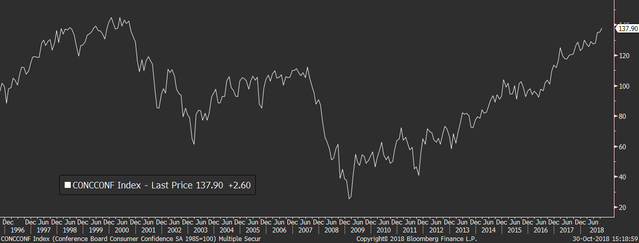 Na makro je úterní seance o něco bohatší než včera. Zaujaly hlavně výsledky evropského HDP, které rostlo v 3Q pouze o 0,2 %, zatímco trh doufal v růst o 0,4 %. Výrazně lépe si pak vedla americká spotřebitelská důvěra, která v minulém měsíci vylétla na 137,9b., což je nejlepší výsledek od roku 2000.