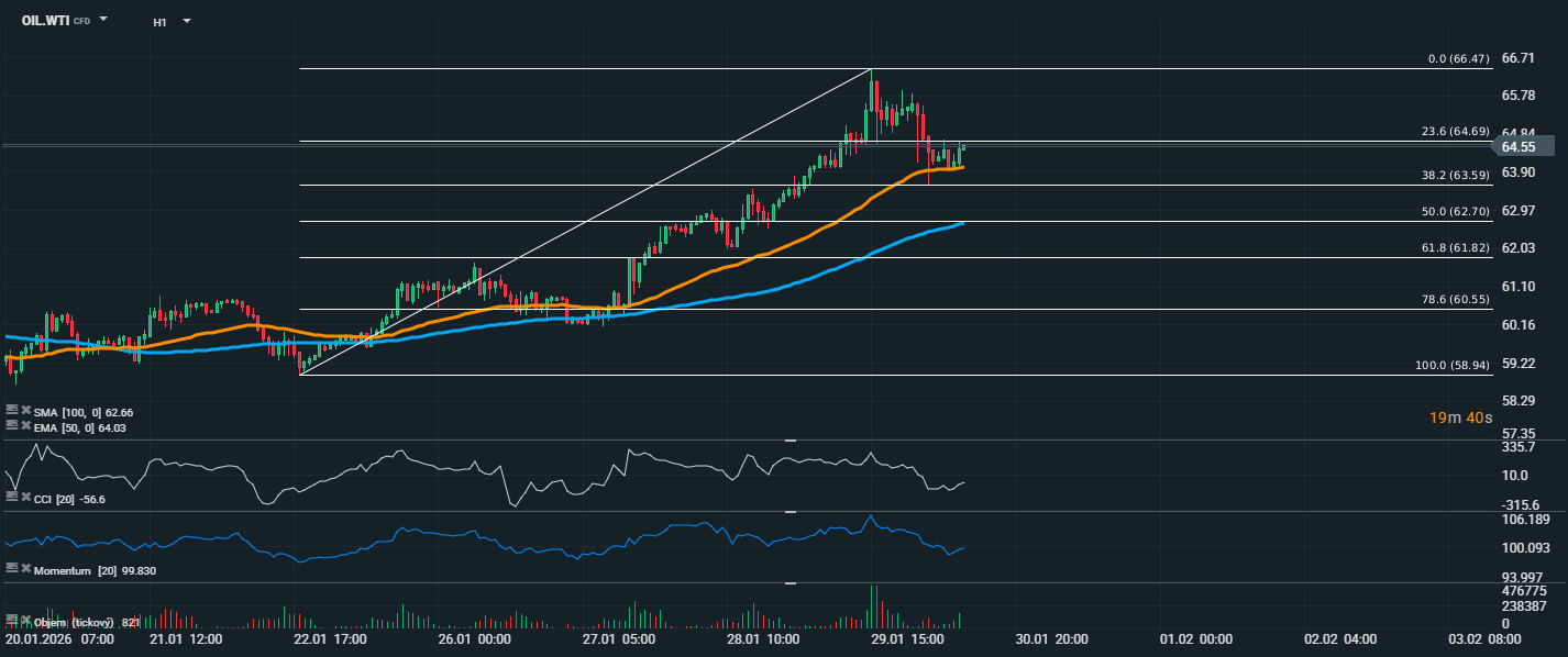Cena ropy WTI po prudkém růstu až k úrovni 66,47 USD začala korigovat a aktuálně se obchoduje kolem 64,55 USD. Trh se tak stáhl k úrovním 23,6 % Fibonacciho retracementu (64,69 USD), která nyní funguje jako krátkodobá rezistence. Z pohledu technické analýzy se jedná o přirozenou korekci v rámci jinak stále pozitivního trendu. Důležitou oporou zůstává EMA 50 (64,03 USD), která byla několikrát otestována a zatím nebyla proražena. Její udržení je klíčové pro zachování růstového scénáře. Další podpora se nachází na úrovni 63,59 USD, což odpovídá 38,2% Fibonacciho retracementu, a následně SMA 100 (62,66 USD) poblíž 50% retracementu. CCI (-56,6) poukazuje na oslabení nákupního momenta a vstup do neutrální až lehce přeprodané oblasti. Momentum (99,8) rovněž klesá, což potvrzuje zpomalení tempa růstu. Objem obchodů zůstává relativně stabilní. Z technického pohledu by průraz nad 64,69 USD mohl otevřít cestu zpět k vrcholu na 66,47 USD, případně výše, pokud by geopolitické faktory znovu oživily nákupní zájem. Naopak průraz pod EMA 50 by mohl znamenat hlubší korekci směrem k 63 USD až 62 USD, kde se nachází silná oblast podpory.