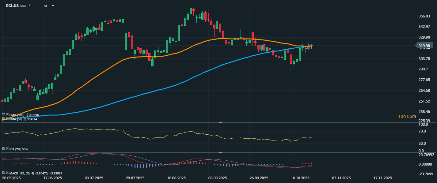 Pro čtvrté čtvrtletí očekává Royal Caribbean upravený zisk na akcii v rozmezí 2,74–2,79 USD, zatímco trh předpokládal průměrně 2,89 USD. Firma dále mírně zvýšila celoroční výhled zisku na 15,58–15,63 USD, ale ani tento rozsah nedosáhl na odhady analytiků, kteří očekávali 15,68 USD.