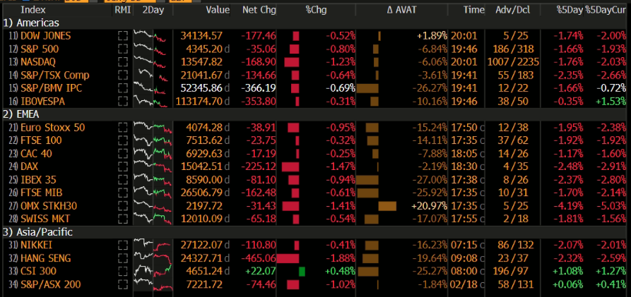 Akciové trhy dnes kvůli nárůstu rizikové averze převážně klesají. Evropa uzavřela komplet v červených číslech a 2 hodiny před koncem seance je obdobná situace také na Wall Street. Zdroj: Bloomberg