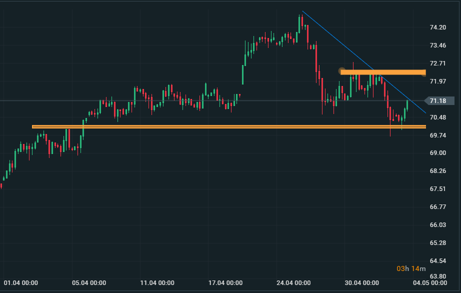 Ropa Brent (OIL) sa odrazila od psychologickej hranice 70 USD a dostala sa ku krátkodobej klesajúcej trendovej línii. V prípade prerazenia tejto línie, je možný rast k úrovni 72,50 USD, kde sa nachádza prvá vážnejšia úroveň rezistencie. Zdroj. xStation5