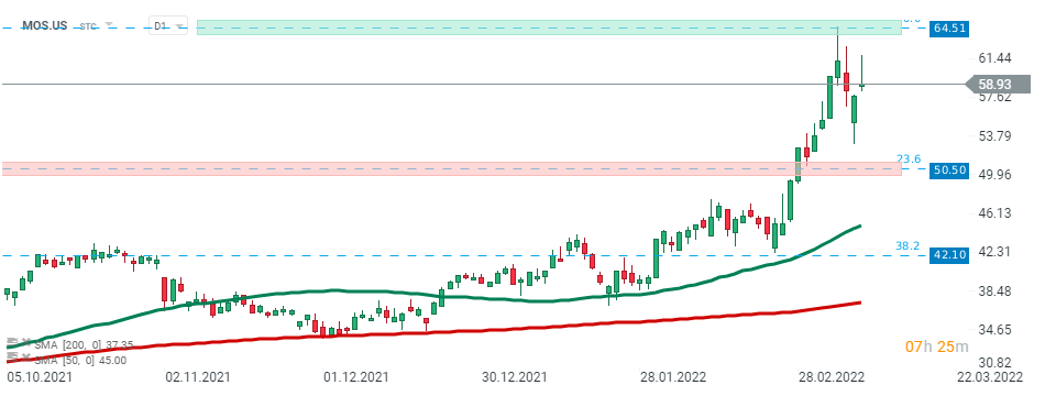 Akcie Mosaic (MOS.US) po Putinově oznámení prudce vzrostly, nicméně zisky byly rychle vymazány, protože se zdá, že mnoho investorů takový krok od Kremlu očekávalo. Zdroj: xStation5