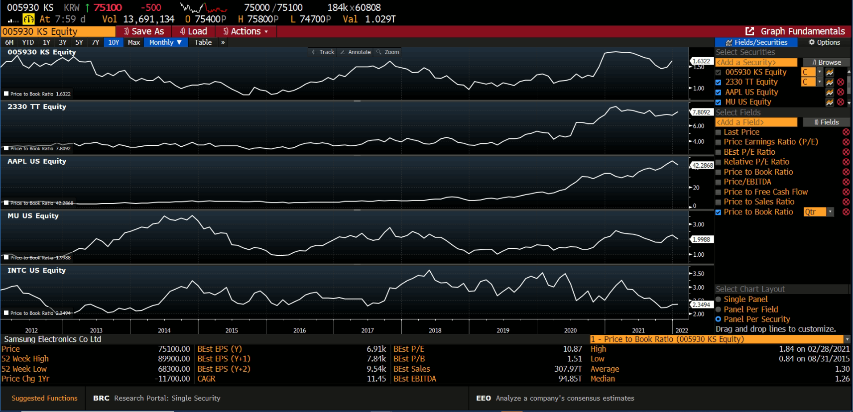 Ak sa na firmu pozrieme z hľadiska P/B, tak aj v tomto prípade je veľmi lacná. Na obrázku dole sme porovnali SE (prvá) s konkurenciou v oblasti výroby čipov či elektroniky. Druhý riadok je P/B TSMC, tretí riadok Apple, štvrtý riadok Micron a piaty riadok Intel. Z obrázku je jasné, že SE je z hľadiska P/B na úrovni 1,63 výrazne lacnejší, ako konkurencia, ktorá sa pohybuje od úrovne 2 až k úrovni 42.