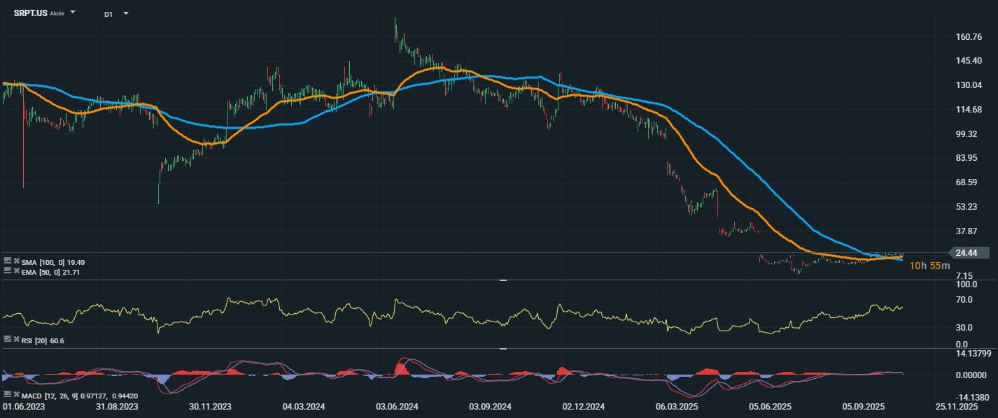 Akcie biotechnologické společnosti Sarepta Therapeutics se dnes před otevřením trhů propadly o 36 %, když firma oznámila, že její klíčová klinická studie pro dvě genově cílené terapie nezaznamenala statisticky významné výsledky. Tento vývoj dále prohloubil obavy o celkovou životaschopnost výzkumného portfolia firmy, zejména v oblasti léčby Duchennovy muskulární dystrofie (DMD).