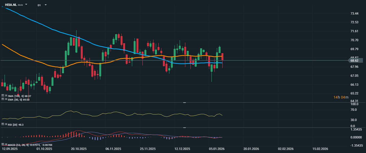 Akcie Heinekenu se aktuálně obchodují na úrovni 68,62 EUR, přičemž se pohybují mezi dvěma klouzavými průměry – SMA 100 na hodnotě 68,37 EUR a EMA 50 na 69,03 EUR. Tento úzký cenový kanál značí nejistotu investorů a absenci jasného směru v krátkodobém výhledu. RSI osciluje kolem 48,3, tedy v neutrálním pásmu, což naznačuje vyvážený poměr mezi nákupním a prodejním tlakem. Žádný extrém v přeprodanosti ani překoupenosti zatím nenastal. Z grafu je patrná dlouhodobá boční konsolidace, přičemž nyni trh reaguje na fundamentální nejistotu po oznámení odchodu CEO a slabých prodejních výhledech. Proražení nad úroveň EMA 50 (69 EUR) by mohlo otevřít cestu k úrovni 70,70 EUR, zatímco naopak pokles pod SMA 100 (68,37 EUR) by mohl vést k otestování hladiny kolem 66 EUR.