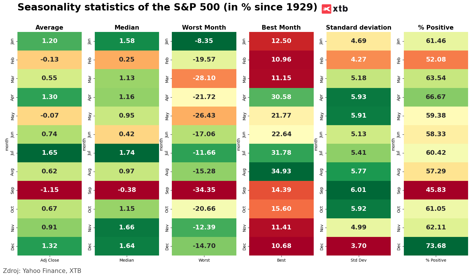 Z obrázku je patrné, že září je v průměru nejhorším měsícem v roce. V něm také došlo k největšímu poklesu, což částečně způsobilo stažení průměru dolů. Mediánová hodnota v září je však stále záporná a činí -0,38 %. Z hlediska kladných měsíců je září také nejhorší a pouze 45 % všech září od roku 1929 bylo kladných. Odchylka je však příliš vysoká a specifická hypotéza by nebyla statisticky podpořena. Na druhou stranu můžeme pozorovat vliv zimních měsíců, kdy s příchodem vánočních tkv převažuje hlavně pozitivní sentiment. "Santa-rally". To potvrzují i údaje o relativním počtu ziskových měsíců, kde je jednoznačně nejpozitivnějším měsícem prosinec a až 73 % historických prosinců bylo ziskových. Na druhou stranu nelze očekávat výraznou rally, když nejlepšími měsíci byly spíše červenec a srpen a naopak zimní měsíce sice rostly, ale obrovské pohyby se zjevně nekonaly. Zdroj: Yahoo Finance, XTB