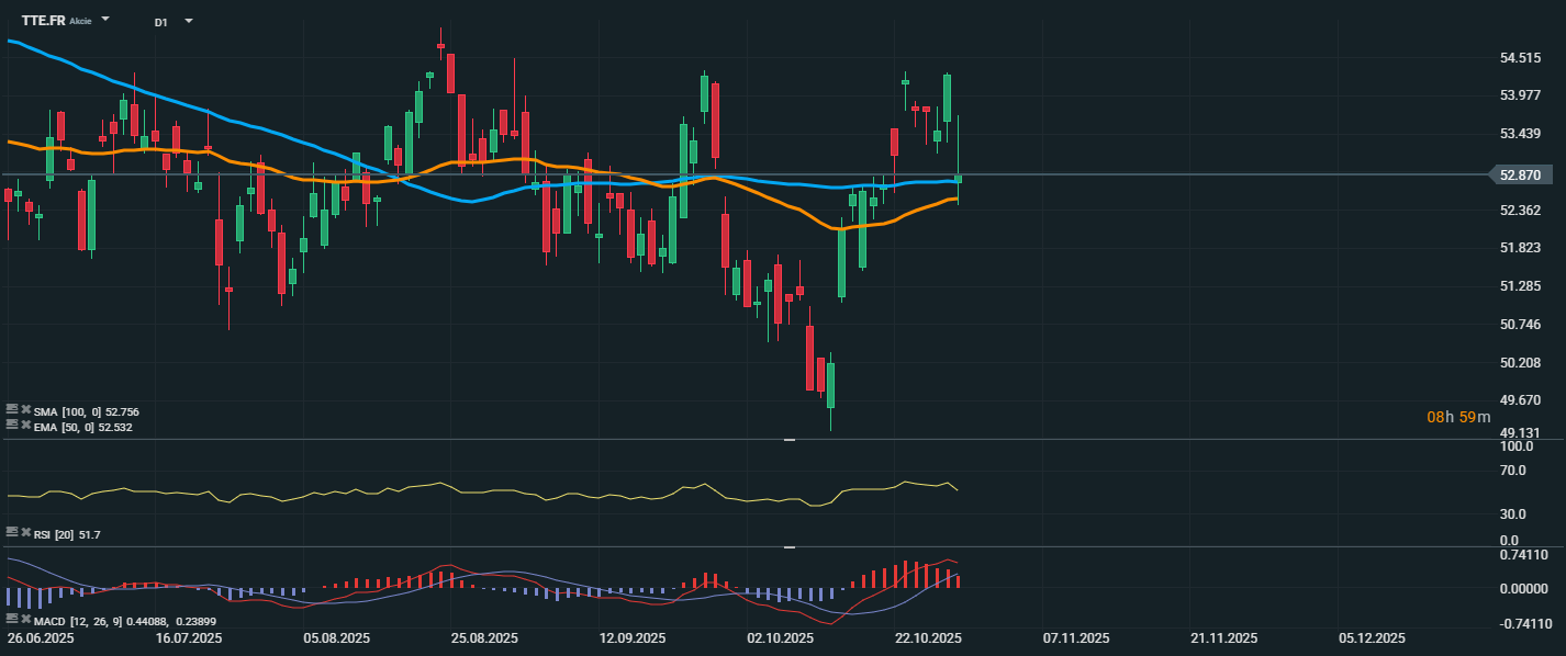 Akcie TotalEnergies se po výsledcích za třetí čtvrtletí stabilizovaly nad důležitou technickou úrovní a aktuálně se obchodují na 52,87 EUR, což je nad oběma klouzavými průměry – EMA 50 (52,53 EUR) a SMA 100 (52,75 EUR). Tím akcie vytvořily potenciální býčí signál, neboť prorazily nad rezistenční pásmo, které v minulosti fungovalo jako silná bariéra. RSI se drží na hodnotě 51,7, což je v neutrálním pásmu a naznačuje prostor pro další pohyb jakýmkoli směrem.