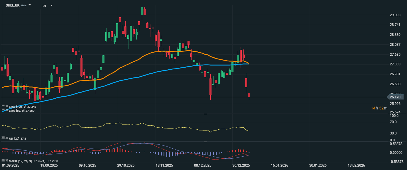 Cena akcií Shell aktuálně klesla pod hladinu 26,20 GBP. Klouzavé průměry EMA 50 (27,37 GBP) a SMA 100 (27,35 GBP) byly proraženy směrem dolů, což signalizuje změnu trendu a převahu prodejního tlaku. RSI se blíží přeprodané oblasti, což značí výrazný pokles kupní síly. Z hlediska supportů se nejbližší významná technická podpora nachází na úrovni 25,57 GBP, kde se cena zastavila během prosincového propadu. Její prolomení by mohlo otevřít prostor pro další pokles směrem k 25,00 GBP, případně nižším úrovním z podzimu 2025.