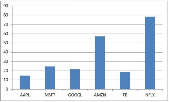 Keď sa pozrieme na tieto akcie, tak štyri zo šiestich majú plus/mínus normálne ocenenie. Pri Apple je dokonca pomer ceny k očakávaným ročným ziskom pod úrovňou 15, čiže o nadhodnotení nemôže byť reč. Facebook, Microsoft a Google sa hýbu okolo 20-násobku ročných ziskov, čo je ešte plus mínus v pohode. Pre porovnanie, počas dot-com bubliny bol pre Microsoft a tento pomer nad úrovňou 50, pre Apple dokonca jeden čas aj nad 400! (ostatné spoločnosti vtedy buď neexistovali, alebo nemali obchodovateľné akcie). Vysoké ocenenia majú aktuálne akcie Amazonu (57) a predovšetkým Netflixu (78). V ich cene je teda započítaný veľmi silný budúci rast ziskov.
