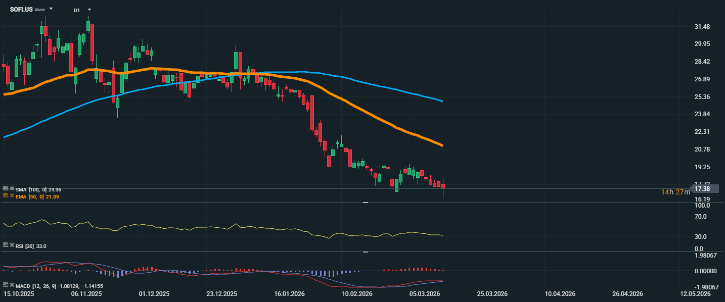 Akcie SoFi se obchodují kolem 17,38 USD a technický obrázek zůstává negativní. Cena se drží výrazně pod EMA 50 na úrovni 21,09 USD i pod SMA 100 kolem 24,96 USD, což potvrzuje pokračující medvědí trend. V posledních týdnech je navíc patrná série nižších maxim i nižších minim, takže prodejci mají situaci stále pod kontrolou. RSI se pohybuje poblíž hodnoty 33, tedy těsně nad pásmem přeprodanosti. To ukazuje na přetrvávající prodejní tlak, ale zároveň i možnost krátkodobého technického odrazu, pokud by se sentiment alespoň částečně stabilizoval. Z technického pohledu je nyní důležité sledovat support v oblasti 17 USD až 16,2 USD. Jeho prolomení by mohlo otevřít prostor k dalšímu poklesu. Naopak první výraznější rezistence leží kolem 19,2 USD, výše pak na 21,1 USD, kde se nachází EMA 50. Dokud se akcie nevrátí nad tyto úrovně, celkové nastavení zůstává spíše negativní.