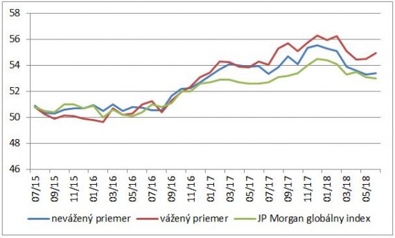 Čo sa týka dlhodobejšieho porovnania, tak aj napriek tomuto spomaleniu rastu je globálna expanzia vo výrobnom sektore stále solídna. Rast spomalil niekde na úroveň z prvej polovice roka 2017, stále je však vyšší ako v rokoch 2012-2016. Ukazuje to vážený aj nevážený priemer indexov výrobnej dôvery z týchto krajín (ktoré tvoria takmer 85% svetového HDP) ako aj globálny index výrobnej dôvery z dielne JP Morgan.