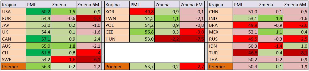 - Takmer všetky ekonomiky (výnimkou sú USA a Kanada) dosiahli vrchol cyklu niekedy na prelome rokov. Ukazuje to tretí stĺpec – zmena za 6 mesiacov, ktorá je takmer pri každej krajine negatívna