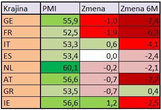 Pozrel som sa aj na to, ako sú na tom jednotlivé krajiny eurozóny (teda tie, pre ktoré takéto indexy existujú). Z ôsmych krajín je možné vyvodiť, že juhu a vo Francúzsku je rast aktivity solídny, v Nemecku, Rakúsku a Írsku ostáva silný a Holandsko dokonca zaznamenáva boom. Medzimesačne však rast aktivity na rozdiel od globálnej úrovne skôr spomaľoval. V porovnaní s koncom roka 2017 však došlo vo všetkých krajinách mimo Grécka k markantnému spomaleniu rastu. Na druhej strane však boli na prelome rokov tieto ukazovatele mimoriadne vysoko a preto ostávajú hedalinové čísla stále dobré.
