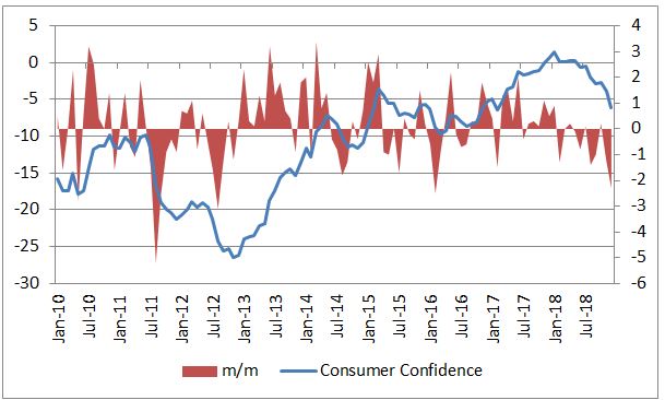 V eurozóne sa zintenzívňuje pokles spotrebiteľskej dôvery. V decembri klesla z -3,9b. na -6,2b., čo predstavuje najnižšiu úroveň od februára 2017. Medzimesačný pokles o 2,3b. je najvyšší od februára 2016 a jeden z najvyšších v aktuálnej dekáde vôbec.
