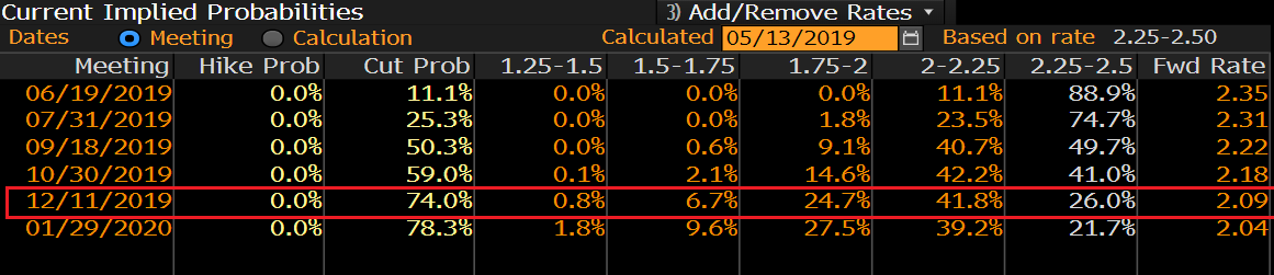Uběhly dva týdny a šance na snížení sazeb jsou znovu nad 70 %. Na vině je samozřejmě strach zobchodní války a z dalšího zpomalení americké ekonomiky.