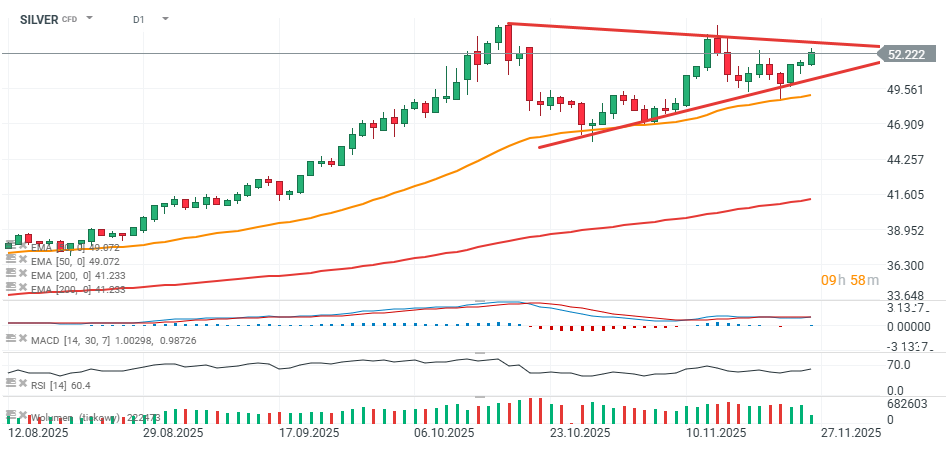 Důležité je, že se cena opírá o silnou podporu kolem 46 USD za unci. Zároveň sledujeme sérii vyšších minim, což naznačuje, že se cena stříbra pohybuje v rámci formace trojúhelníku, přičemž klíčová zóna se nachází kolem úrovně 53 USD. Pokud se ceně nepodaří tuto oblast prorazit, může následovat dynamický návrat k poklesu. Naopak průraz nad 53 USD by představoval učebnicový breakout z býčí formace, po kterém by mohla cena pokračovat vzhůru k historickým maximům kolem 54,5 USD, případně je překonat, pokud přetrvá optimismus ohledně snižování sazeb v USA a "anti-dolarová" nálada.