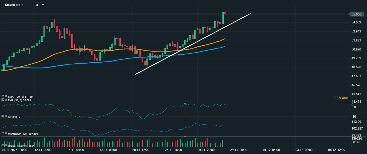 Cena stříbra na grafu prorazila na nové historické maximum 55,00 USD a aktuálně se konsoliduje těsně pod touto úrovní. Trh se nachází v silném rostoucím trendu, což potvrzuje rostoucí trendová linie i pozice ceny nad důležitými klouzavými průměry. Klouzavý průměr EMA 50 (52,08 USD) i SMA 100 (51,15 USD) slouží jako podpůrné úrovně a drží směr vzhůru. Cena stříbra se dlouhodobě udržuje nad oběma průměry, což potvrzuje tržní dominanci kupců. Momentum (107,5) i Williams %R (-7) naznačují, že se trh nachází v překoupené zóně, což je běžný jev během silného býčího trendu. Zatím ale nejsou vidět signály obratu – naopak, pozitivní momentum a pokračující objemy obchodů podporují scénář dalšího růstu. Korekce by mohla přijít přirozeně, pokud by cena nedokázala překonat hranici 55 USD a investoři by vybírali zisky.