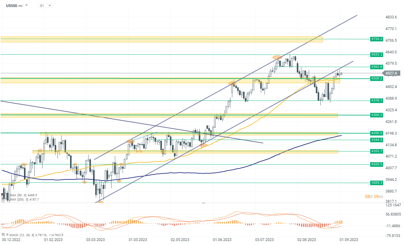 Dnes jsou trhy v USA uzavřeny kvůli svátku Den nezávislosti. Obchodování s podkladovými nástroji neprobíhá a burzy zůstávají uzavřeny. V důsledku toho je volatilita u CFD kontraktů snížena, ale přesto indexy US500 a US100 dnes ukazují mírný růst, podpořený silnými zisky v Číně. V následujících dnech stojí za pozornost projevy členů FOMC, protože trhy se pokusí zohlednit pravděpodobnost dalšího zvýšení úrokových sazeb. Po nedávných makroekonomických datech jsou šance na zvýšení sazeb na zasedání v září nízké a pravděpodobnost posledního očekávaného zvýšení sazeb letos také klesá. Před zasedáním FOMC budeme mít také příští týden zveřejněnou inflaci CPI v USA, která bude poslední významnou zprávou před rozhodnutím Fedu.