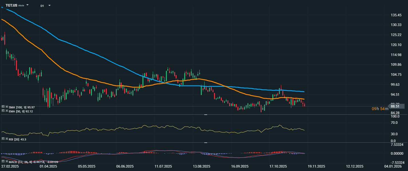 Akcie společnosti Target se aktuálně obchodují na ceně 88,51 USD a nadále zůstávají pod tlakem v rámci dlouhodobého sestupného trendu. Cena se nachází pod oběma klouzavými průměry – EMA 50 (92,12 USD) i SMA 100 (95,97 USD) – což značí slabé technické nastavení a pokračující medvědí sentiment. RSI se pohybuje na úrovni 43,3, což ukazuje na přetrvávající slabost kupců, ale zatím se stále nenachází v pásmu přeprodanosti.