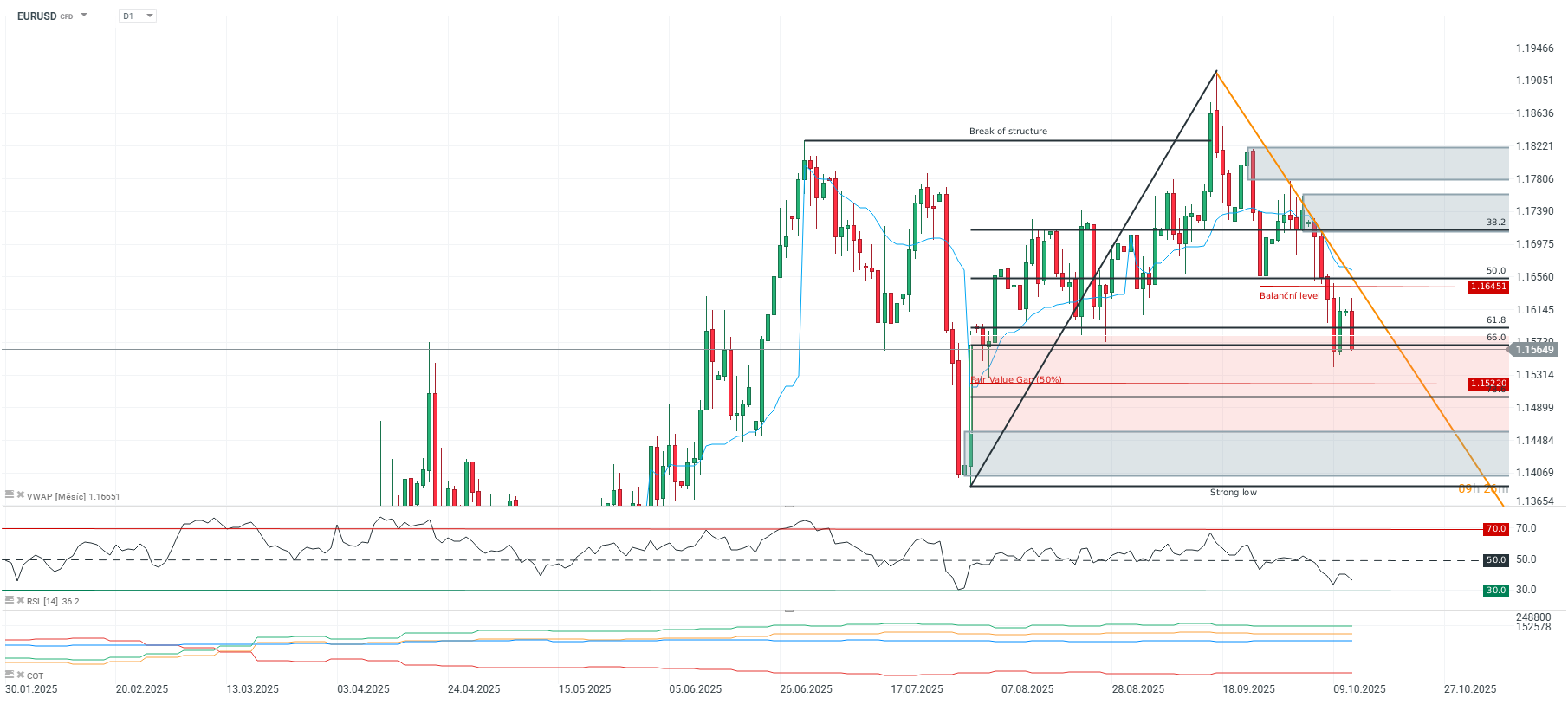Cíl poklesu leží na 1,1522 (FVG 50 %) a případně 1,1400, zatímco COT data dál favorizují silnější dolar.