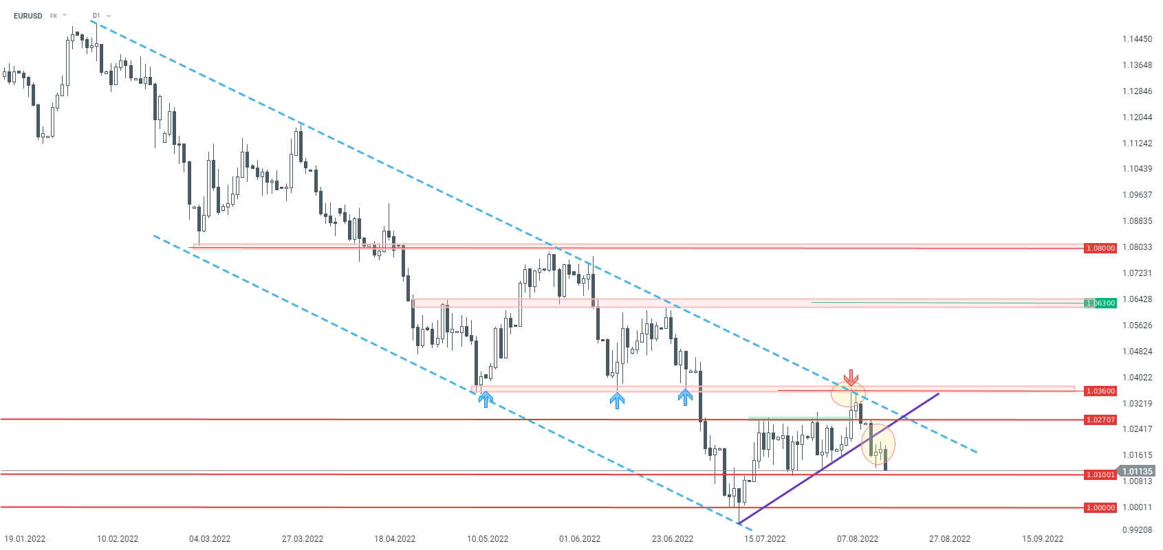 Již delší dobu se kotace hlavního měnového páru EURUSD vyskytují v sestupném trendu. Při pohledu na graf je možné určit cenový kanál, ve kterém se cena pohybuje již od února letošního roku. Nedávná korekce, která minulý týden zrychlila, byla okamžitě zastavena. Cena se odrazila od rezistence na 1,0360, která byla důsledkem předchozích cenových reakcí (označeno šipkami) a trendové linie nedávných maxim. Nyní se cena pomalu přibližuje k úrovni 1,0100. Pokud by došlo k pokoření této hranice, není vyloučen pokles k 1,000. Vypadá to, že poměr sil by mohlo změnit až prolomení úrovní 1,0270 a 1,0360. Technická analýza však naznačuje i možné pokračování poklesů.