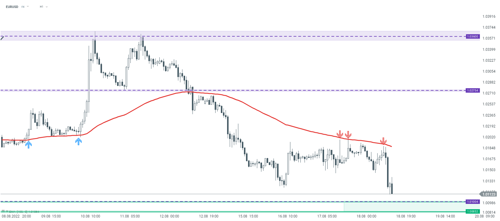 Při pohledu na graf s nižším časovým rámcem je patrné, že situace přeje spíše prodejcům. Nyní je nutno říci, že průměr posledních 100 relací (EMA100), který včera i dnes zastavil větší růst. Vypadá to, že dokud bude pár pod touto úrovní, existuje šance na útok úrovně 1,0100. Pokud by došlo k prolomení nad výše zmíněnou úroveň (červená linie), jen tak může dojít ke změně sentimentu.