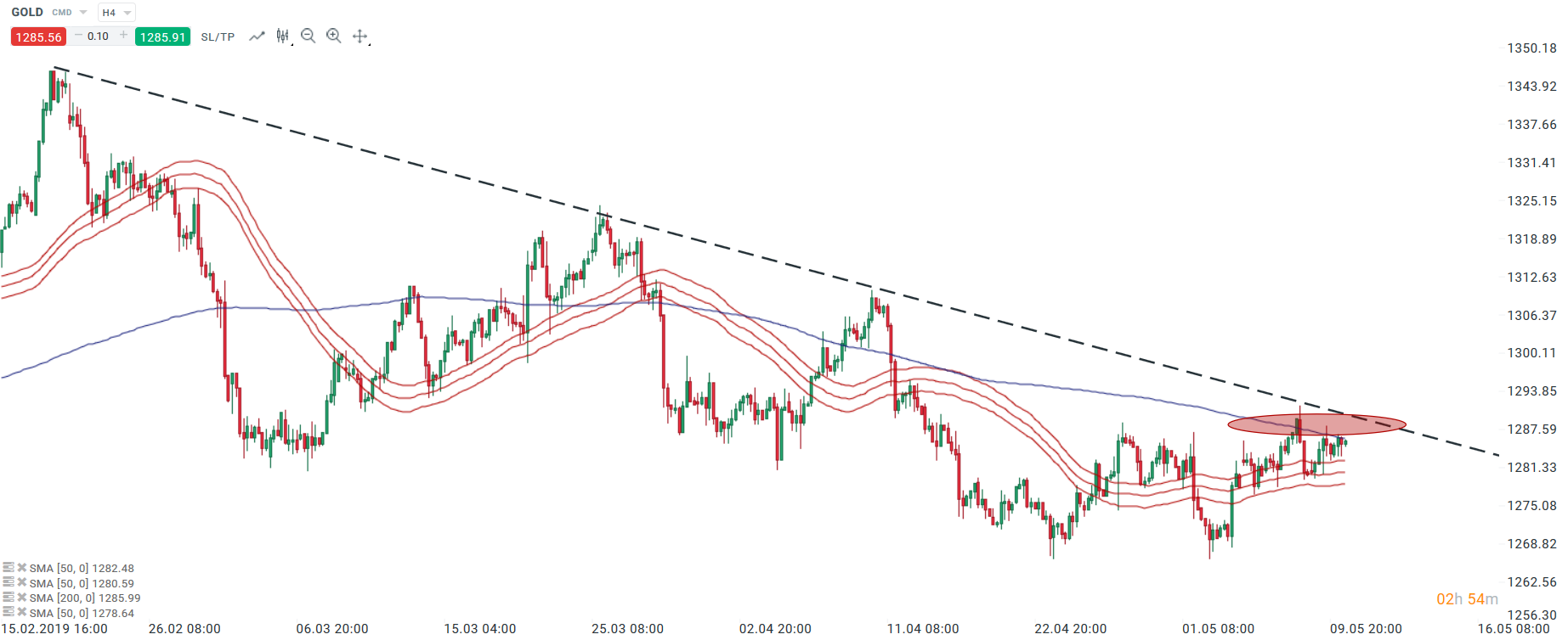 Na H4 grafe si môžeme všimnúť, že drahý kov sa obchoduje pod 200-periódovým kĺzavým priemerom a klesajúcou trendovou líniou. Prerazenie vyššie (nad 1287-1290 USD), by mohlo podnietiť optimizmus medzi kupujúcimi a tlačiť ceny smerom nahor. Pohyb nahor by sa teda mohol rozšíriť až k hornej hranici trojuholníkovej formácie. Posledná úroveň lokálneho minima by mala slúžiť ako najbližšia úroveň supportu.