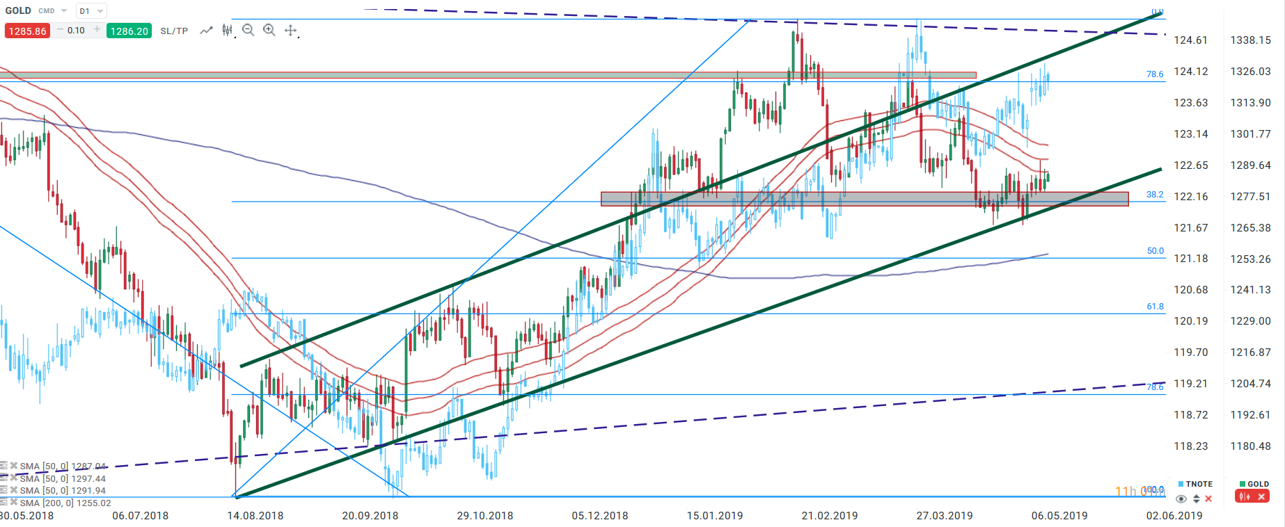 Na dennom grafe si môžeme všimnúť, že býci zastavili pokles v oblasti 1270 – 1280 USD. Na tejto úrovni možno nájsť aj rastovú trendovú líniu, ktorá slúži ako spodná úroveň rastového trendového kanála. To znamená, že nemôžeme vylúčiť pohyb smerom nahor. Nárast obchodného napätia medzi USA a Čínou by malo podporovať bezpečné aktíva, vrátane zlata a TNOTE (modrá časť grafu nižšie). Rastový pohyb smerom k úrovni 1325 USD podporuje aj korelácia medzi zlatom a TNOTE.