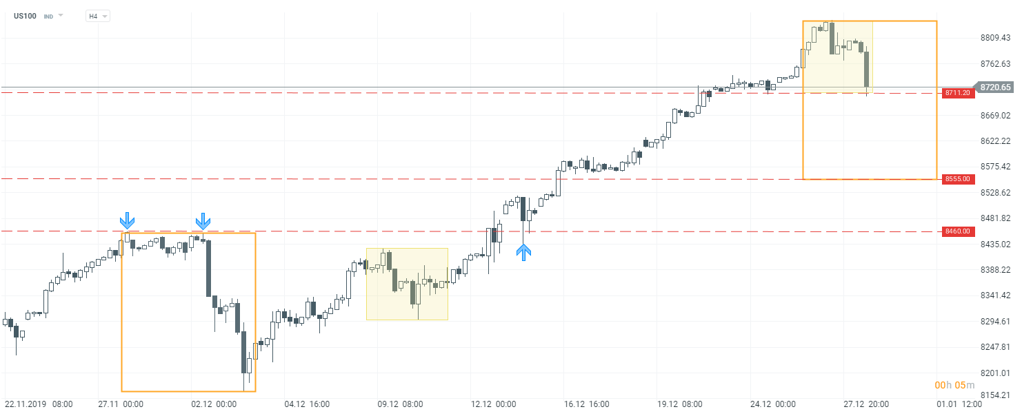 Pokud se podíváme na graf indexu US100, tak je zřetelné, že cena narazila na lokální support. Úroveň 8711 bodů je hladinou spodní limity struktury 1:1, která je největší korekcí posledního růstového trendu s počátkem na začátku měsíce. Průraz pod tuto úroveň by mohl znamenat výraznější pokles. Nicméně by obchodníci neměli zapomínat na fakt, že hlavní trend zůstává býčí. Růstový scénář by byl zneplatněn, pokud by cena prorazila úroveň 8460 bodů.